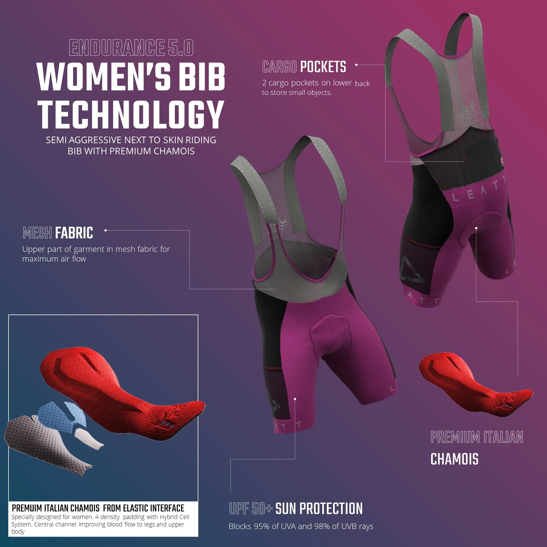 Introducing the MTB Endurance 5.0 bib for women, a must-have piece of gear for those long, challenging rides. Crafted with a premium Italian chamois pad and 4 layers of padding, it offers up to 7 hours of support and incredible comfort. Designed for semi-aggressive riding positions, this bib features low wind resistance, UPF 50+ sun protection, convenient cargo pockets, and cutting-edge carbon blend fabric. Whether it's a epic cross-country trek or your favourite trail, the Endurance 5.0 bib helps you push your boundaries and achieve your goals.