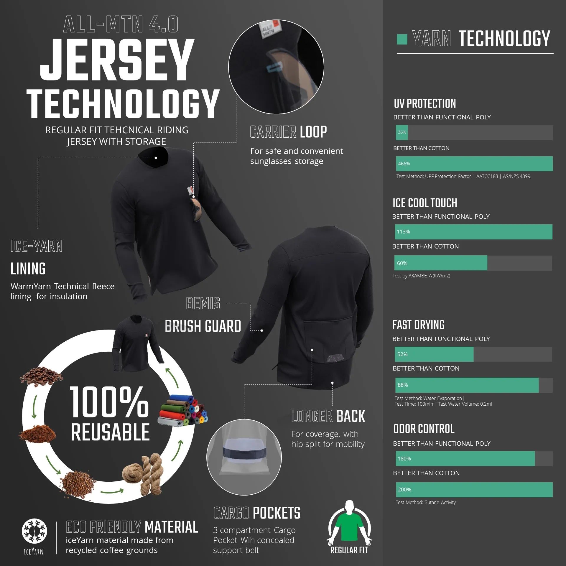 Beyond aesthetics and comfort, the All-MTN 4.0 jersey focuses on practicality. Storage is ample with the three-compartment cargo pocket on the rear, supported by a concealed waist belt and a sunglasses carrier loop on the chest. A longer back section ensures ample coverage, complemented by a hip split for added mobility. Anti-abrasion panels, stealth reflective trim, and UPF 50+ protection underline the jersey’s commitment to your safety, making it perfect for MTB riders and eBikers alike.