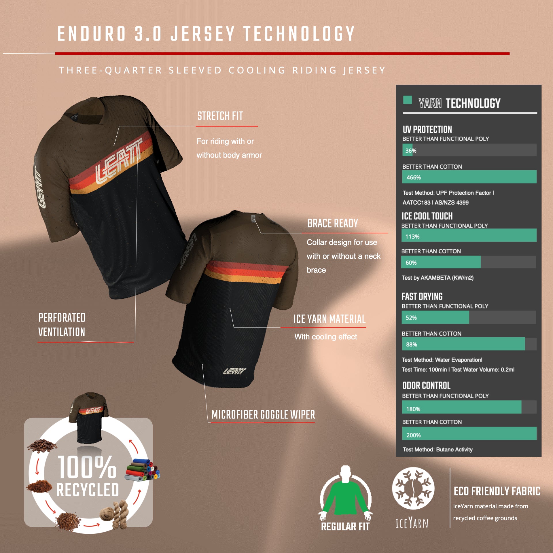 The Enduro 3.0 jersey is made from a cool touch IceYarn fabric. IceYarn is made from utilized coffee grounds and coated with a unique cool-touch solution. Suitable for sensitive skin, this high-performance jersey keeps you feeling fresh all day. IceYarn is a fast dry material which dries 200 times faster than cotton!
