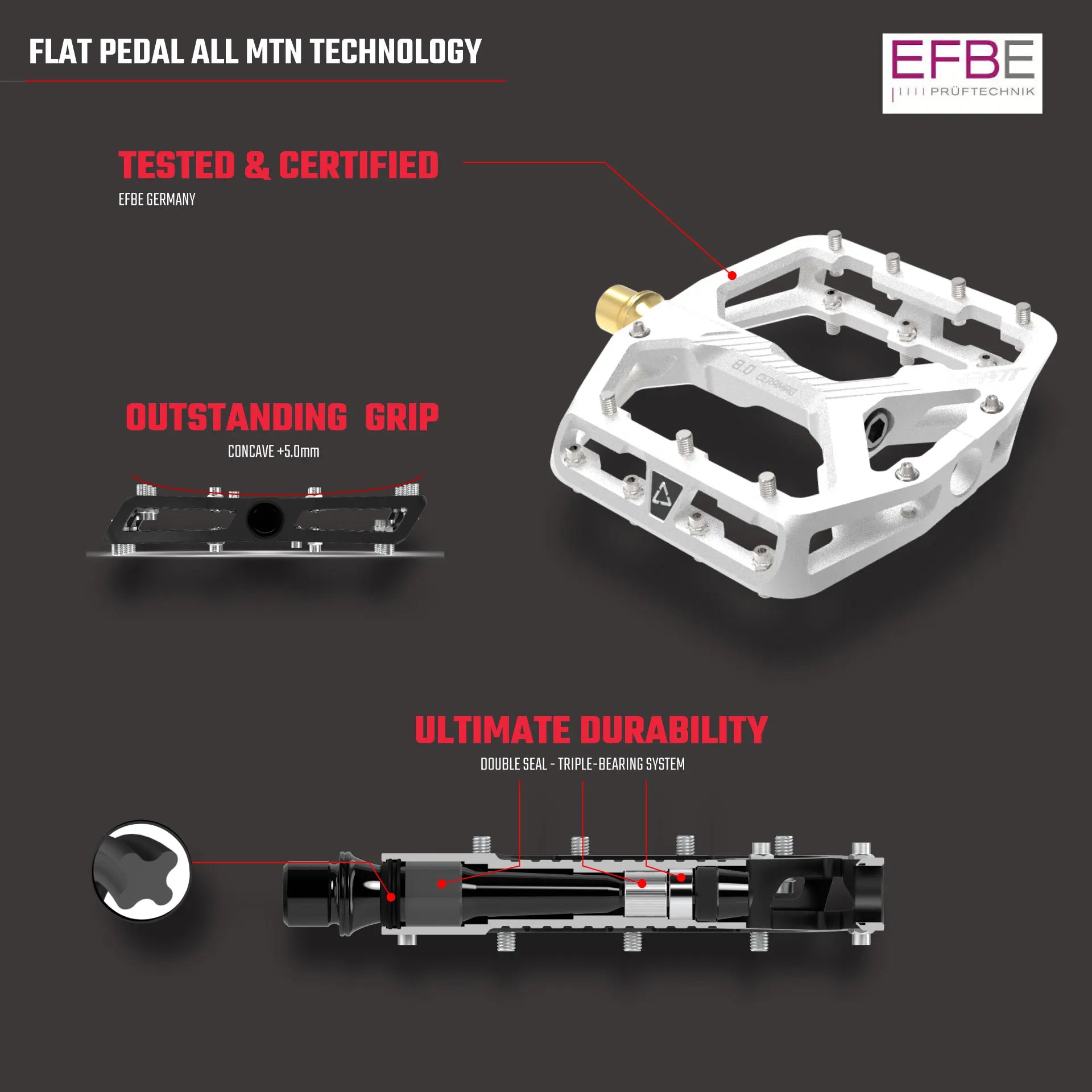 CNC-machined, robust and lightweight pedal made of 6061-T6 aluminum. The pedals weigh 381 grams per pair — approximately 190 grams per pedal. It utilizes an ultra-robust forged and CNC-machined chromoly steel axle. The fully serviceable triple-bearings system consists of a LSL self-lubricating bushing, a needle bearing, and a sealed ball bearing. Quad lip seals ensure the internals remain dirt-free even in the harshest conditions. While it is not the most slimline pedal at 16mm, it features a 5mm concavity for grip and pedal feel. There are 10 stainless steel pins per side (7 bottom loaded threaded pins and 3 top loaded diamond studs). The platform size is 114mm x 100mm (Narrow) or 114mm x 107mm (Wide) for maximum support and stability. The pedal is tested and certified to EFBE EPAC Gravity TRI-TEST® standard (category 5).