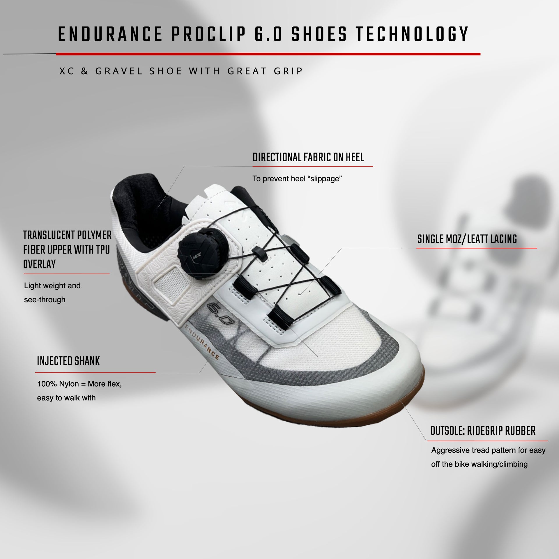 Endurance shoe (XC & Gravel) with a lightweight and see-through polymer fiber upper. The 100% nylon shank gives more flex than the carbon version, making these shoes easier to walk in. The sole features RideGrip rubber with an aggressive tread pattern for easy off-bike climbing in wet conditions. The cleat slots are extended for a greater range of adjustment. The single MOZ/Leatt lacing discs make fit adjustment a breeze. The directional fabric on the heel locks it in, avoiding any chance of slip, even if only loosely tightened. The ProClip 6.0 Endurance shoe has been developed in collaboration with Speed Company pro riders (winners of the Cape Epic 2022, winner of the 2024 European MTB XC Marathon).