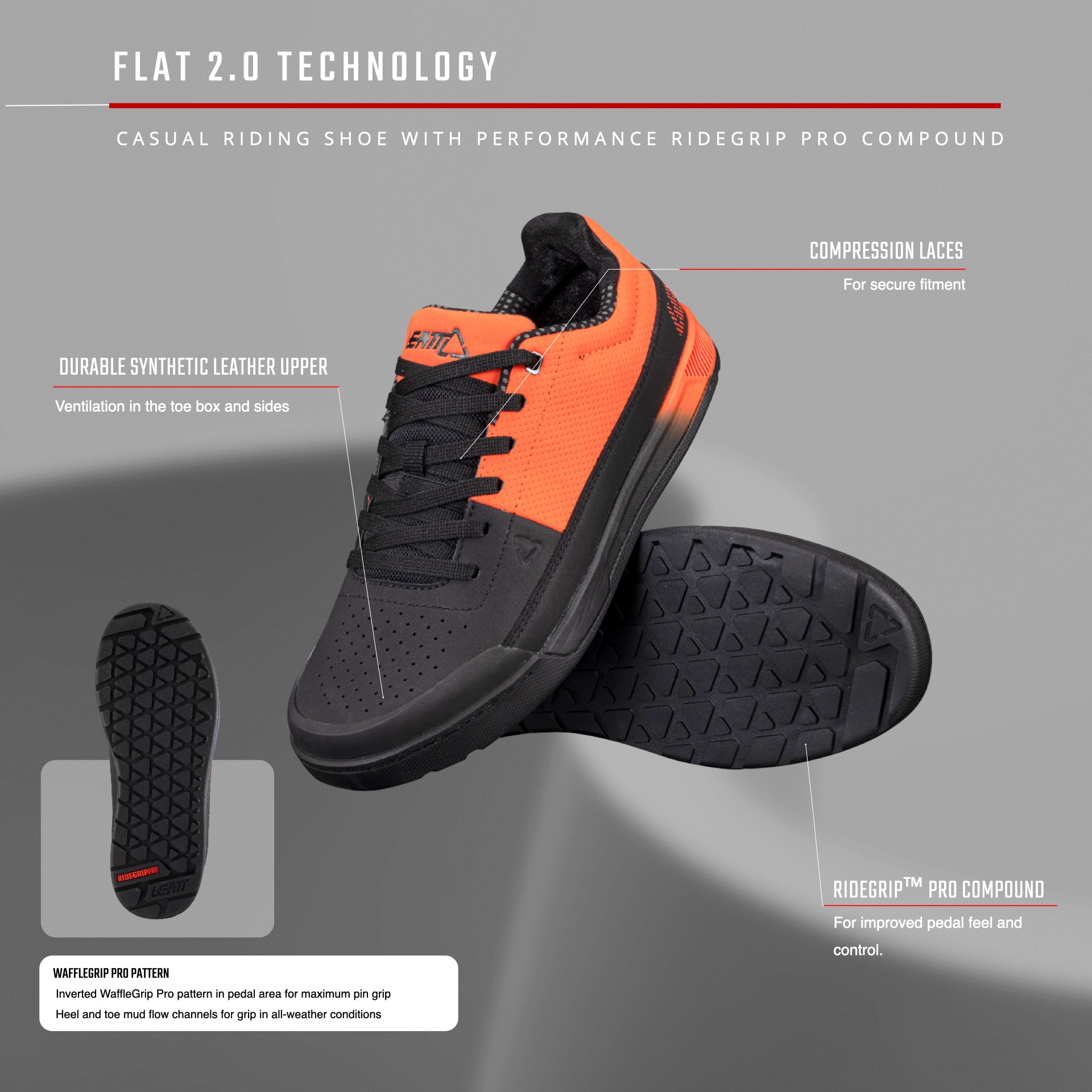 The all new Leatt MTB 2.0 shoe is a casual looking shoe transformed into a comfortable and well ventilated riding shoe. It features a soft sole, which gives you great pedal feel through the shoe and lets you also walk around in ease.