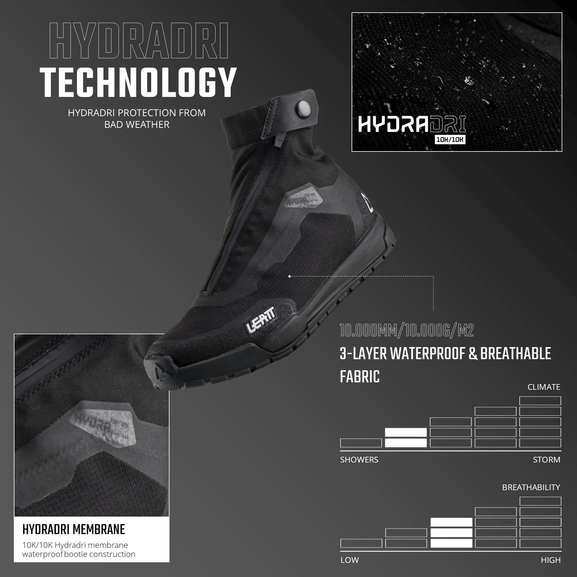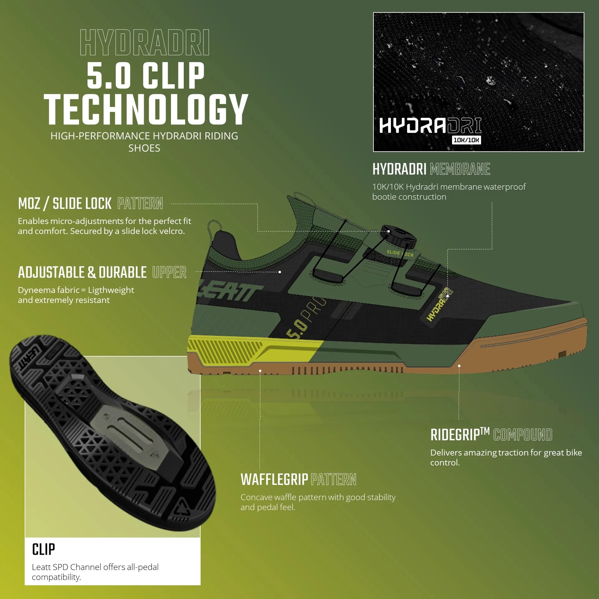 Introducing the Leatt MTB HydraDri 5.0 ProClip Shoe - the highest standard of all-weather adaptability. Built with a HydraDri membrane, the shoe is completely waterproof while still remaining fully breathable. The clip ensures universal pedal compatibility, while the RideGrip compound guarantees the ultimate in bike control and durability.