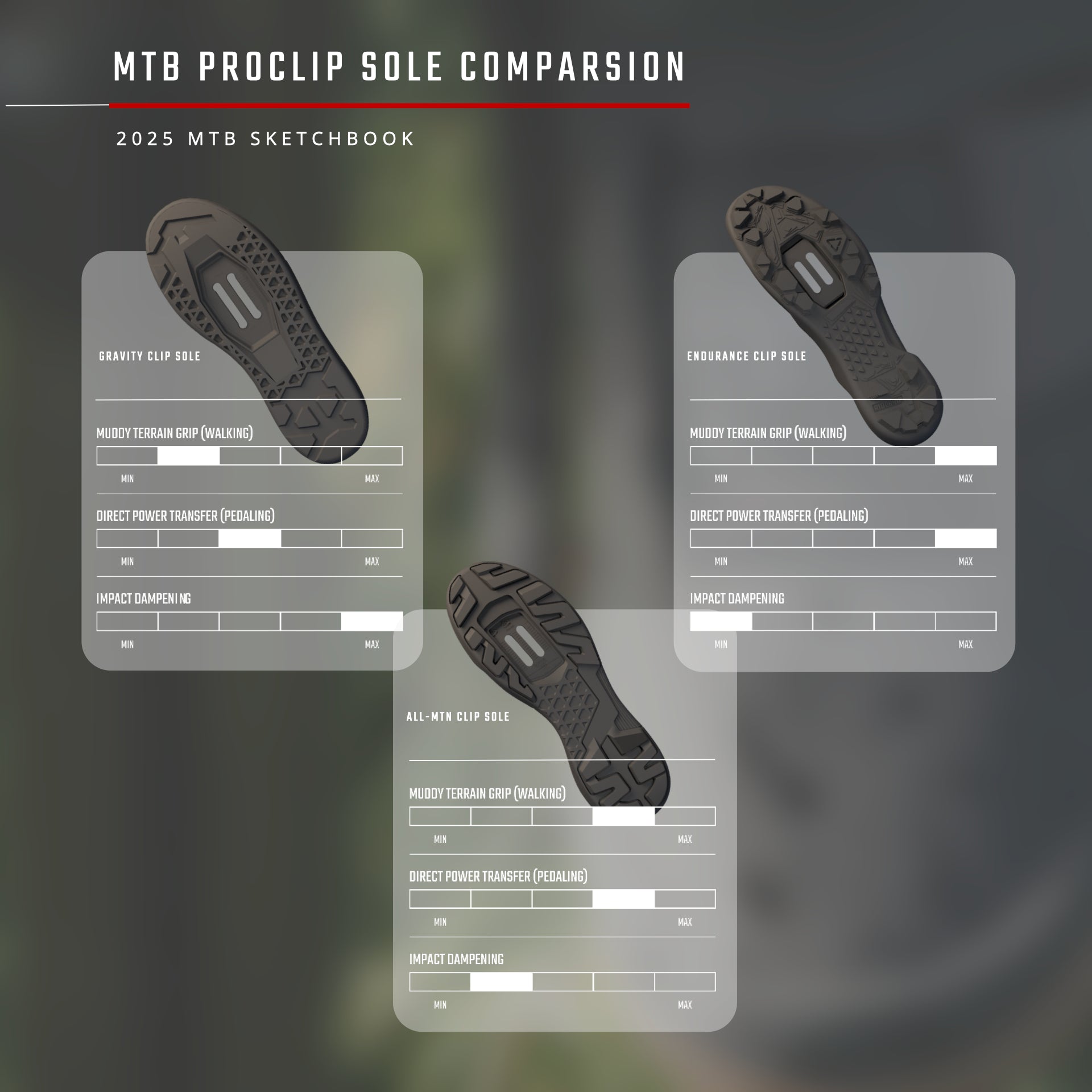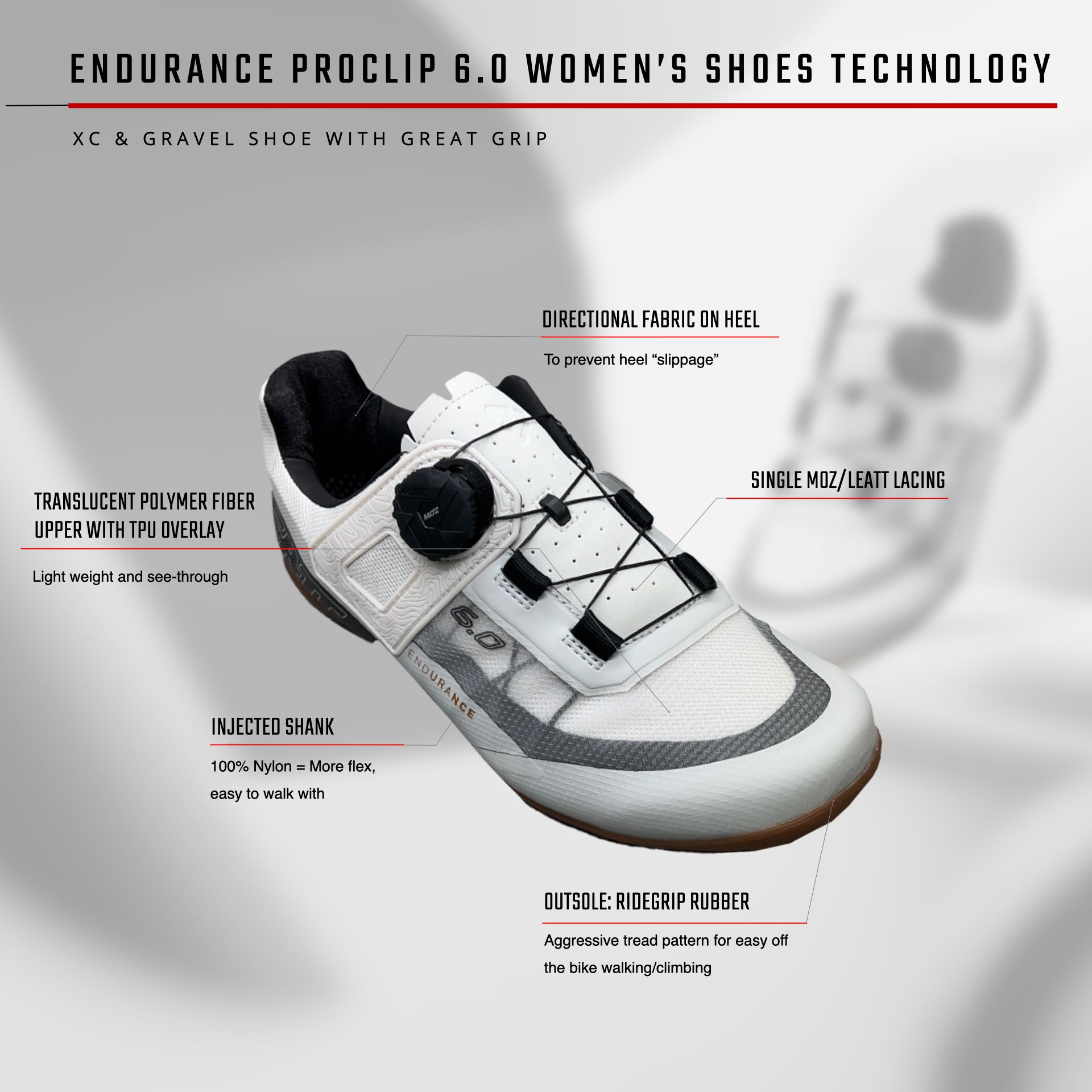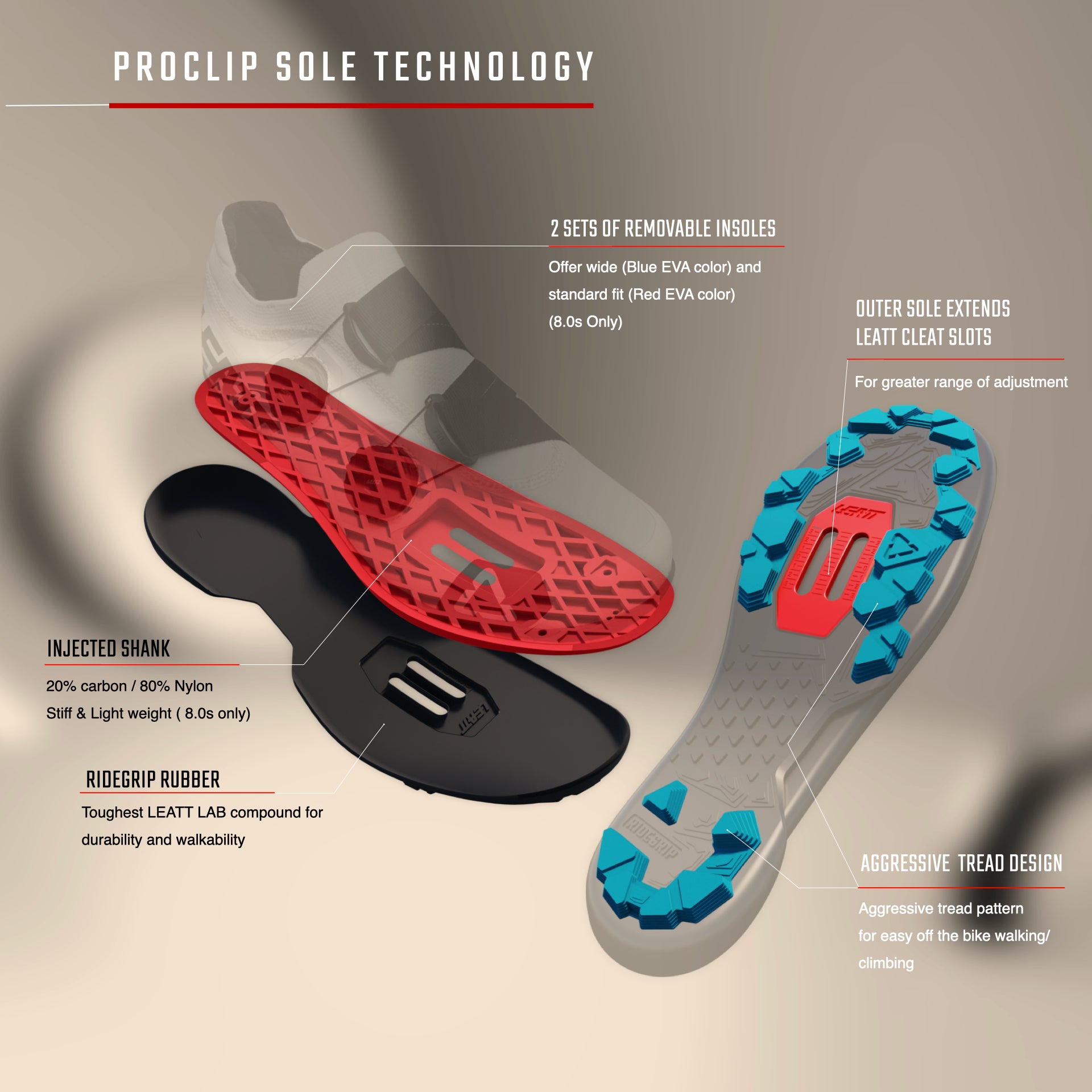 Endurance shoe (XC & Gravel) with a lightweight and see-through polymer fiber upper. The 100% nylon shank gives more flex than the carbon version, making these shoes easier to walk in. The sole features RideGrip rubber with an aggressive tread pattern for easy off-bike climbing in wet conditions. The cleat slots are extended for a greater range of adjustment. The single MOZ/Leatt lacing discs make fit adjustment a breeze. The directional fabric on the heel locks it in, avoiding any chance of slip, even if only loosely tightened. The ProClip 6.0 Endurance shoe has been developed in collaboration with Speed Company pro riders (winners of the Cape Epic 2022, winner of the 2024 European MTB XC Marathon).