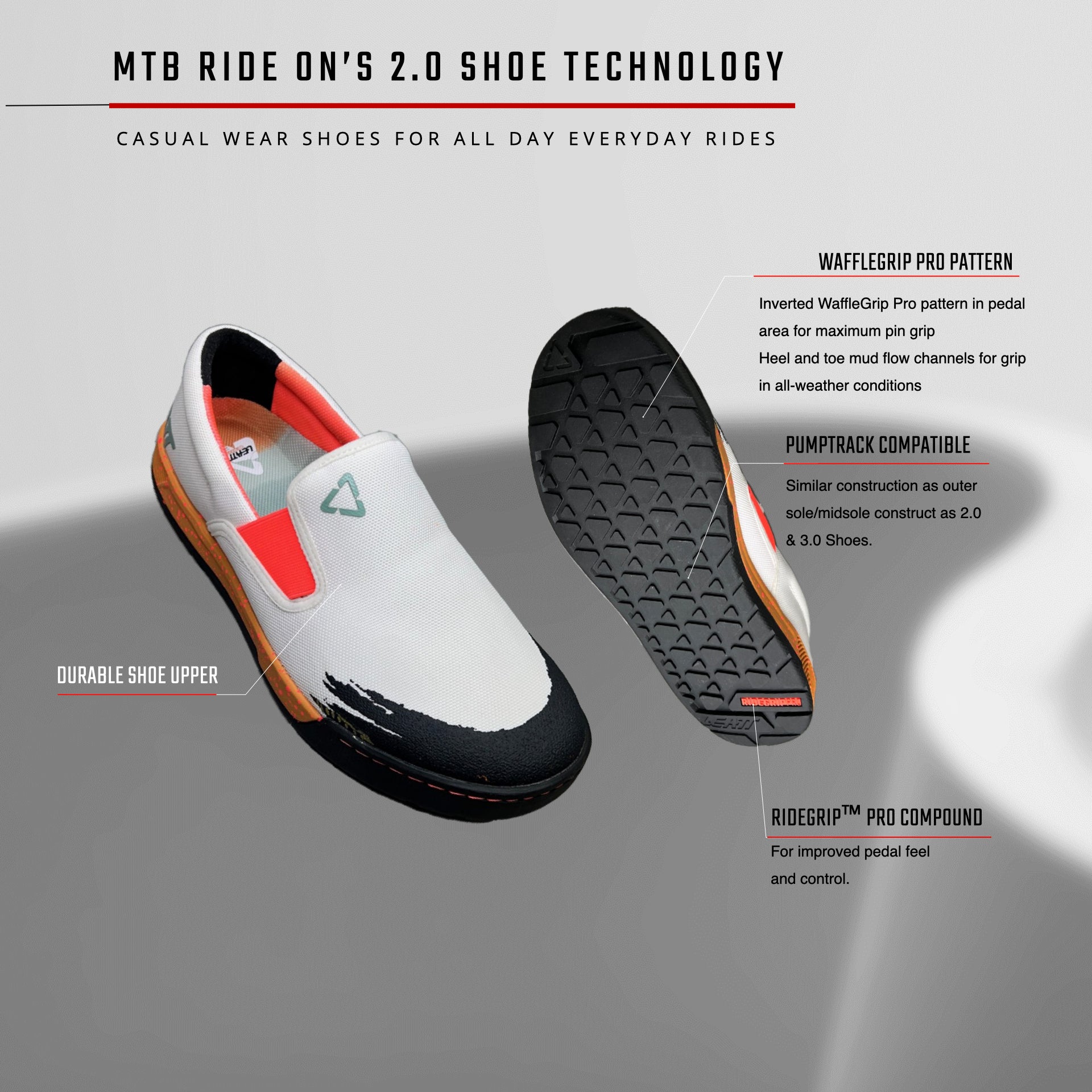 Slippers for riding bikes?! You better believe it! These easy on/off shoes are an ideal choice for commuting rides or pumptracks. The directional fabric on the heel prevents slippage. The Leatt MTB 2.0 RideOn shoe is casual looking and comfortable. It features a soft sole for great pedal feel through the shoe and lets you walk around with ease. In terms of grip, the sole features a RideGrip™ Pro rubber compound. Softer than the standard RideGrip™ rubber, the sole has increased pedal connectivity and will hold better grip in slippy conditions. The improved WaffleGrip Pro sole pattern allows short pins to dig deep into the sole and delivers great off-bike traction when you need to walk. Be prepared to ride, anytime, anywhere!